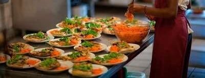 Vi serverer primært vegetarisk mad. Kød/fisk serveres et par gange hver måned (der er altid vegetarisk alternativ).